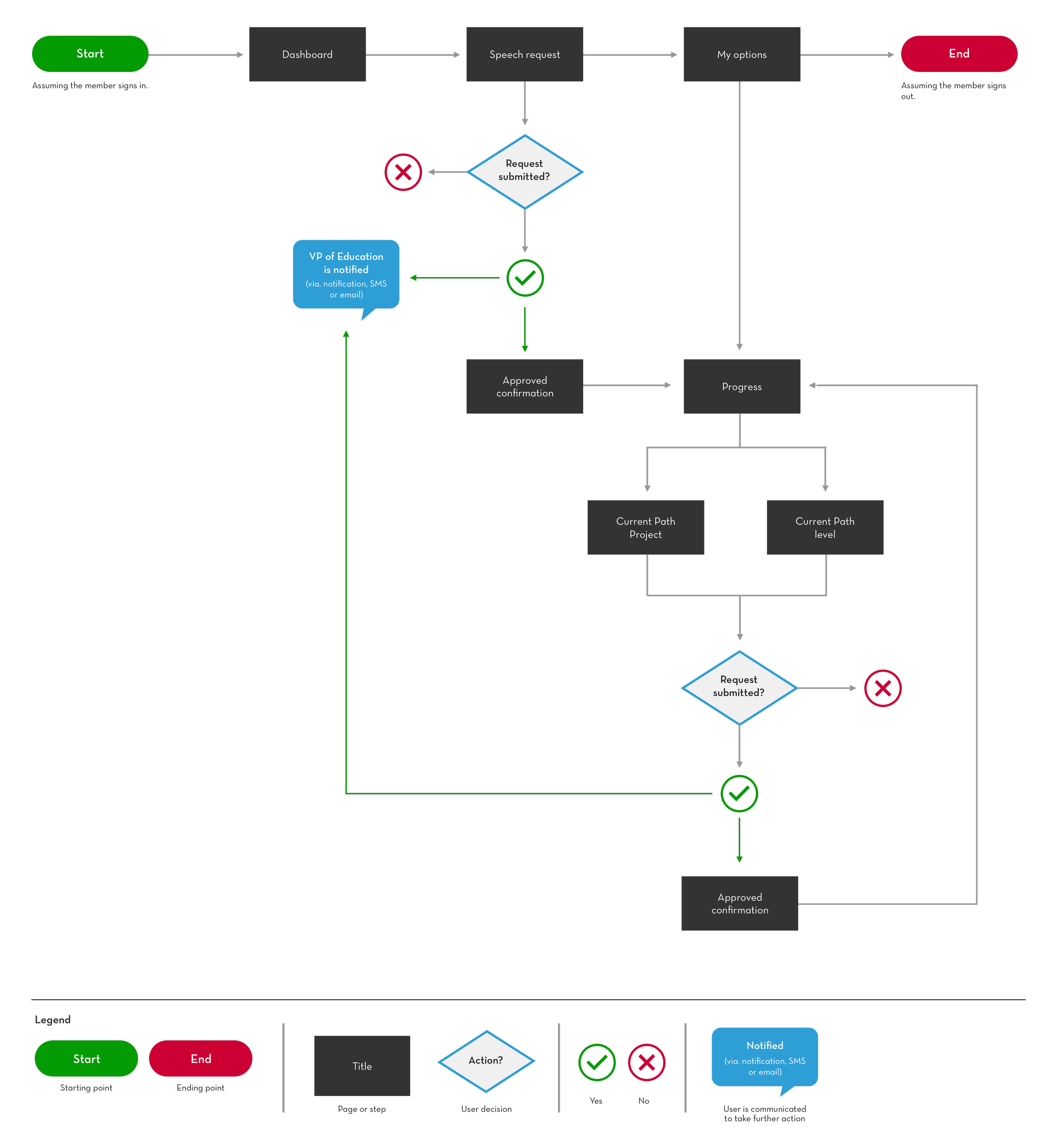 At this point, I was ready to map out a user flow that typically describes the users’ interactions of the platform. An example of user scenarios that required me to think critically was when a member requests a speech and sets their Pathways goals to get approved by the VP of Education.