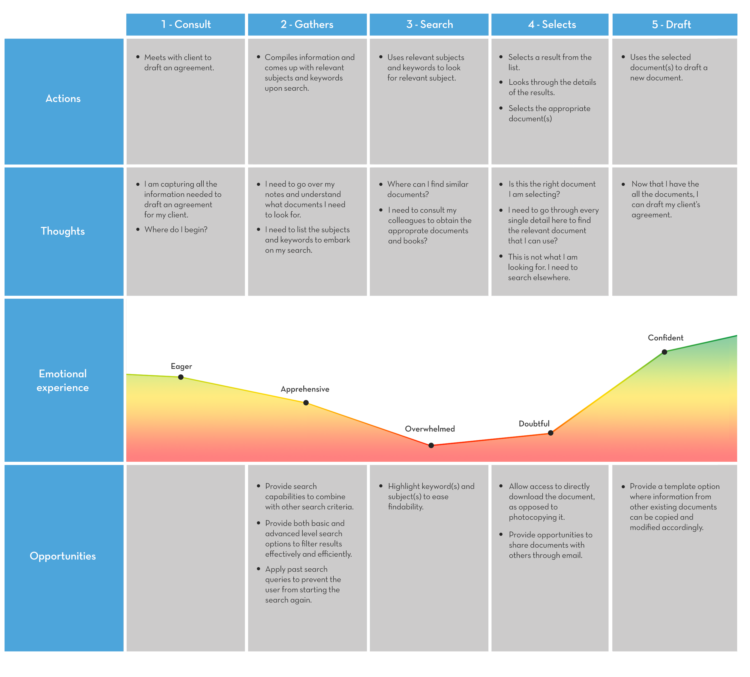 Working on a user journey map allowed us to deeply understand our persona's experiences when managing and delivering legal documentation to achieve the end goal. Identifying all the touch points that our persona goes through in this journey, we were able to pinpoint the frustrations and discover potential opportunities to define viable solutions to meet our user needs in designing this platform.